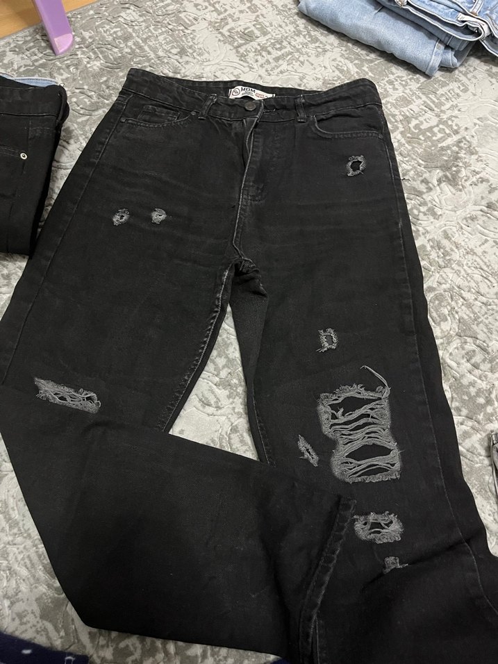 Siyah Bol Kesim Yırtık Kot Pantolon