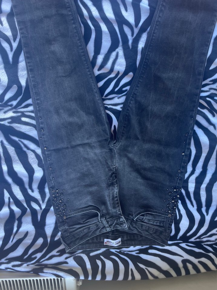 Siyah renkli, bağcıklı detaylara sahip regular fit denim kot pantolon. Günlük kullanım için uygun, grunge punk tarzını yansıtıyor.