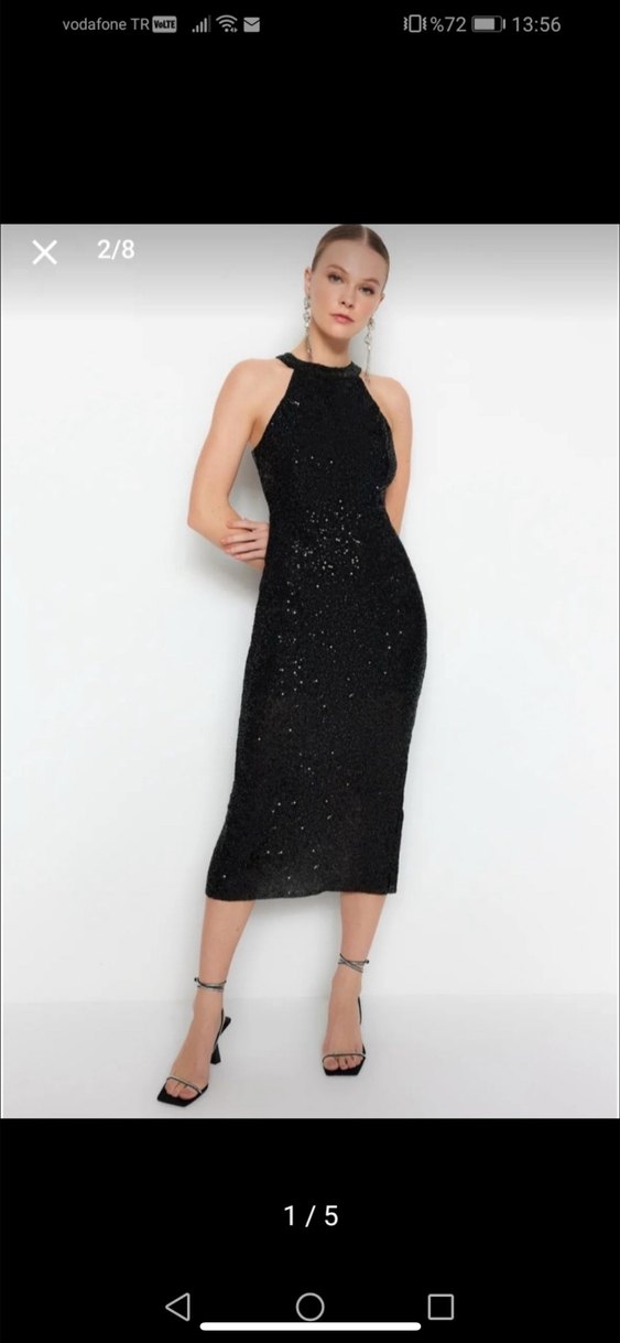 Yüksek yakalı, kolsuz, vücuda oturan siyah abiye elbise, parlak boncuk işlemeli detaylara sahip, cesur ve göz alıcı bir tarz sunar. ✨