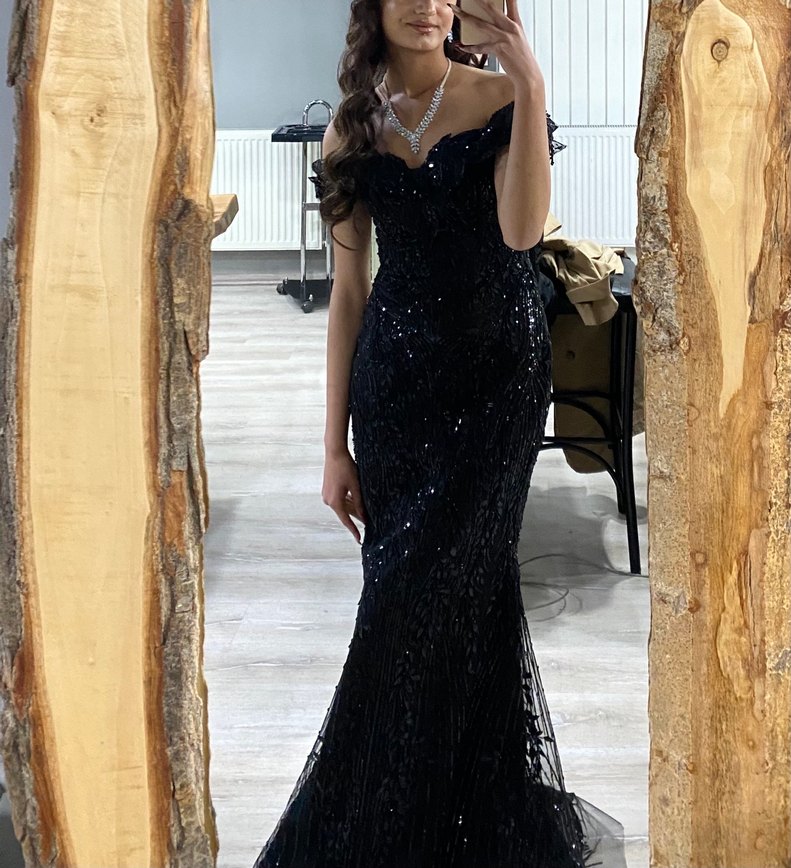 S,M,L beden uyumlu Siyah, boncuk işlemeli ve desenli, uzun ve vücuda oturan abiye elbise. Kayık yaka tasarım elbise