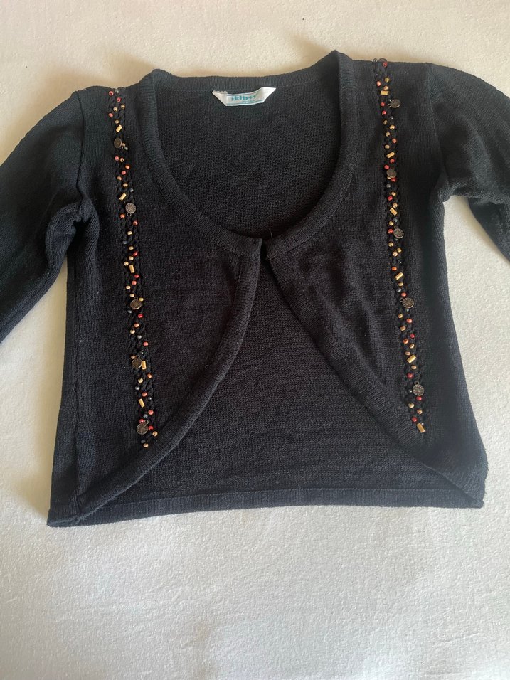 uzun kollu, dar kesim bolero. Yumuşak örme kumaş ve boncuk işlemeli detaylarla süslenmiştir.