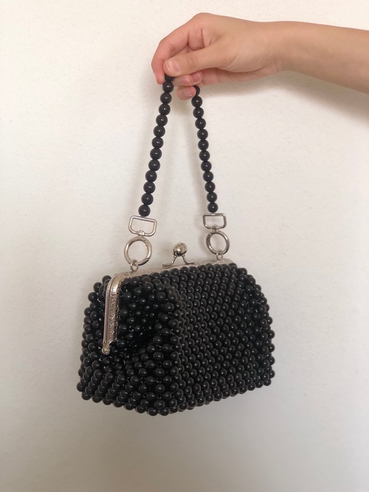 Siyah boncuk işlemeli, örgü kumaştan vintage tarzda el çantası. Gotik ve klasik zarafet dokunuşuyla günlük kullanım için uygundur.