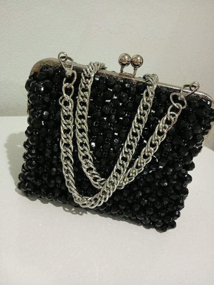 Siyah boncuk işlemeli, gümüş zincir saplı, desenli ve gotik tarzda örme kadın çantası. 10 mm boncuk Özel günlerde kullanılır