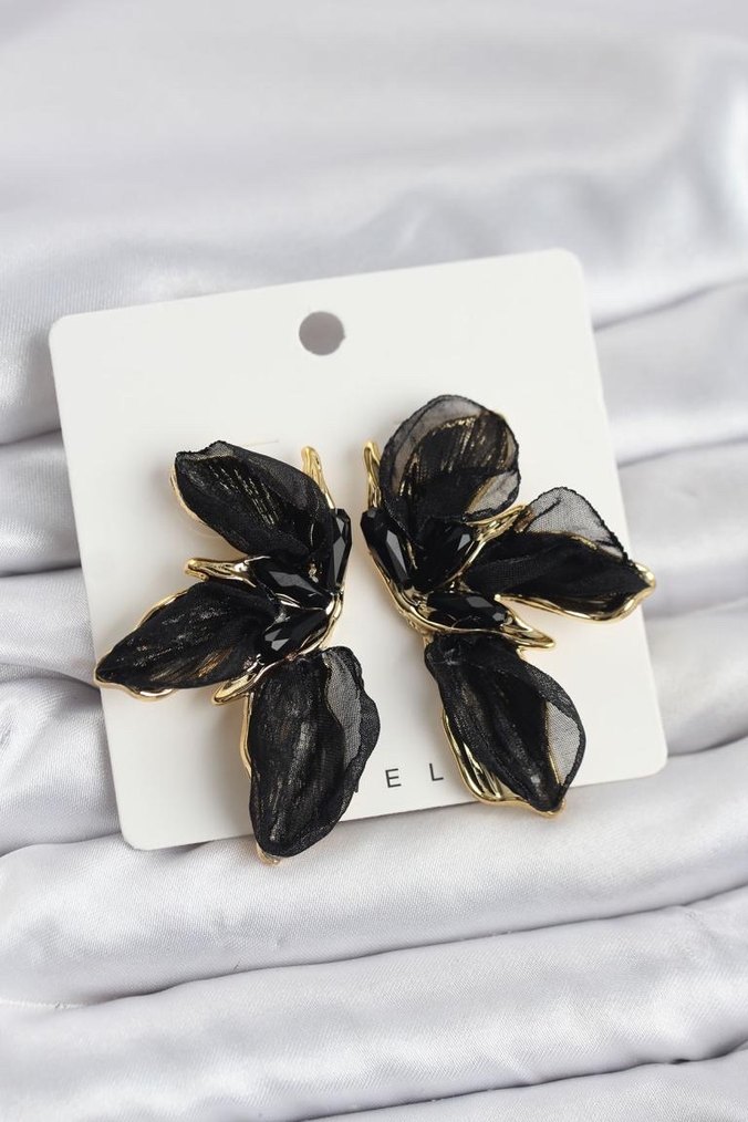 Kısa siyah küpeler, boncuklu çiçek deseni ve çağdaş tarzıyla düğün ve şık görünümler için uygundur. 11630
