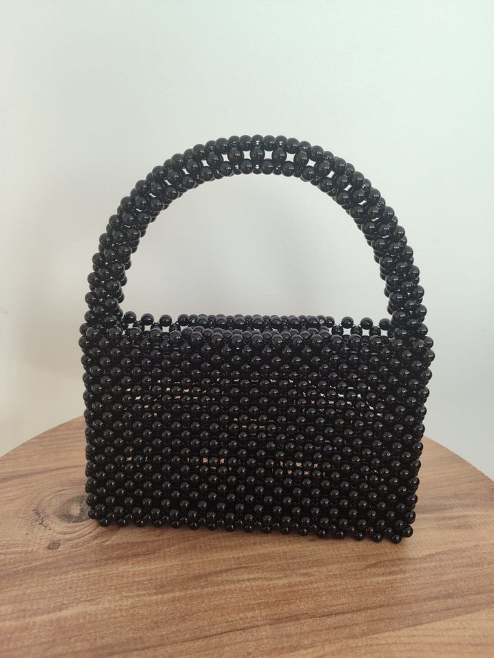 Siyah boncuklu, plastikten yapılmış minimalist tasarımlı kadın çanta. Yuvarlak saplı, desensiz ve bohem tarzda sade bir model.