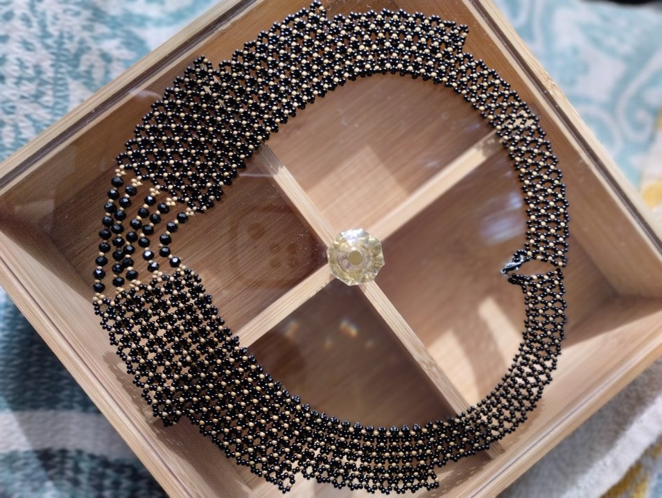 Uzun, siyah boncuklarla işlenmiş ve altın tonlarında kadın kolye. Düğünler için çağdaş ve avangart tarzda.