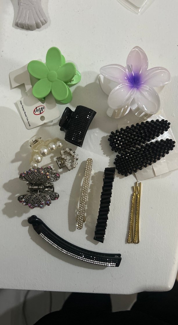 Siyah boncuklu tokalar ve inci, çiçek detaylı çeşitli saç tokalarından oluşan kadın saç aksesuarları seti. Trend ve avangart tarz için uygundur. İlk üç görsel en pahalı ürünlerdendır . Çok şıkürünlerdır ayrıca son gorseldekı küpelerde eklenmıştır