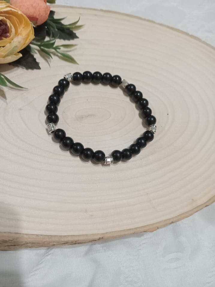Siyah boncuklar ve gümüş detaylarla sade, gotik tarzda günlük kullanıma uygun kadın bilekliği. Desensiz ve koyu renklidir.