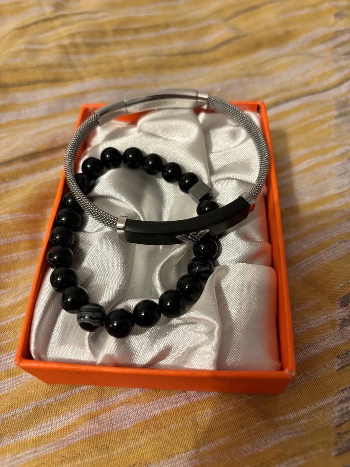 Desenli boncuklu siyah bileklik ve şık çağdaş gümüş bileklikten oluşan set, günlük kullanıma uygun cesur tarzda.