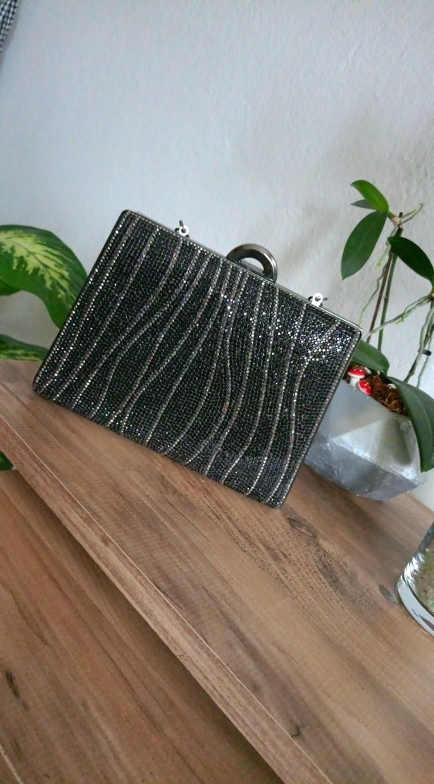 Plastik malzemeden yapılmış, boncuklu yılan desenli siyah abiye çanta. Çağdaş tasarımıyla şık parti kombinlerine uygundur.