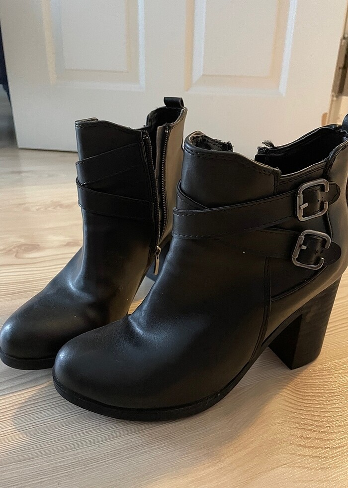 Siyah bilekte bot yanları detaylıdır platform topuk olduğundan az birşey rahat bir bottur 9 cm topuk boyu vardır