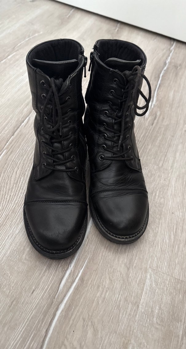 Siyah deri, bağcıklı, bot günlük kullanım için düz yüzeylidir.
