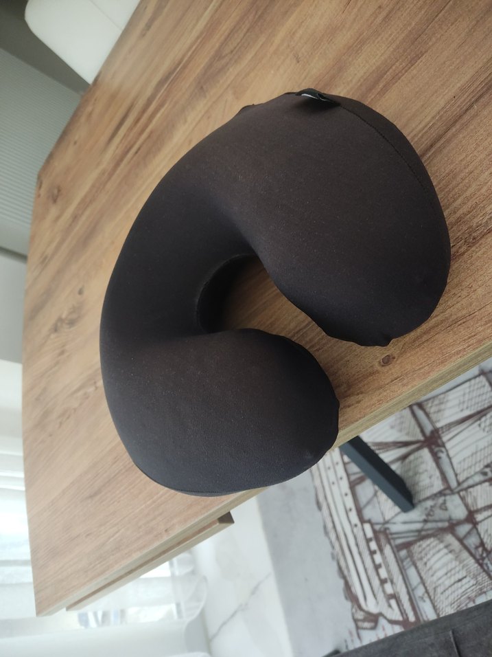 Siyah boyun destek yastığı, seyahat veya dinlenme sırasında konfor sağlar. Yumuşak kumaş ve ergonomik şekil boyun ağrısını hafifletir.