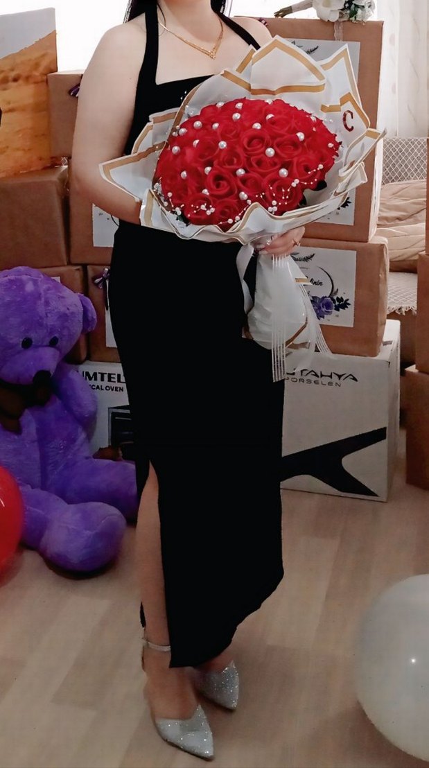 siyah boyundan bağlamalı yandan yırtmaçlı midi elbise