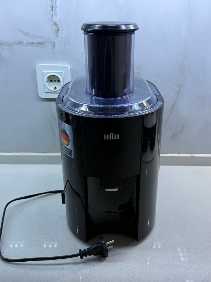Geniş besleme tüpü ve kompakt tasarıma sahip siyah Braun katı meyve sıkacağı. Şeffaf kapağı ve kullanımı kolay güç kablosu bulunur.