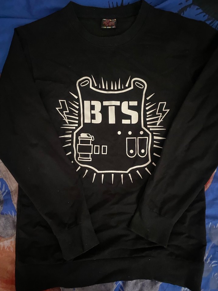 Siyah, uzun kollu, yuvarlak yakalı, bol kesim kadın sweatshirt. Üzerinde BTS baskısı bulunur. Günlük rahat kullanım için uygundur.