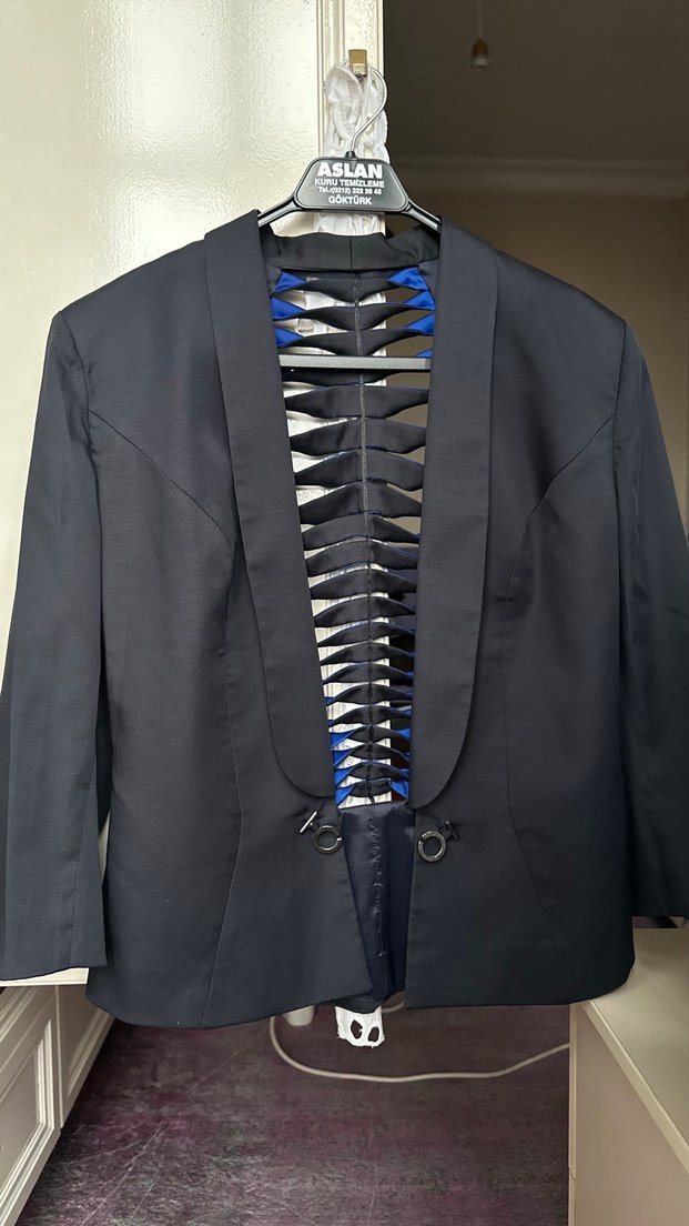 Siyah renk, notched lapel yaka ve strappy kollara sahip, buckle detaylı avant-garde tarzda midi uzunlukta kadın blazer. Sentetik kumaştan, ofis kullanımı için uygundur.