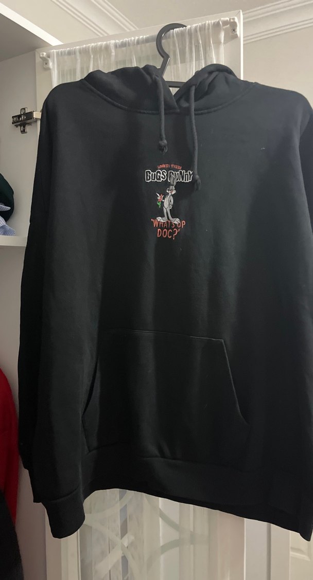 Siyah, bol kesim, Bugs Bunny baskılı ve fermuarlı detaylı sweatshirt. Uzun kollu, yuvarlak yakalı, rahat midi boy tasarıma sahip.( xl ve xxl beden giyenlere de olur baya bol )