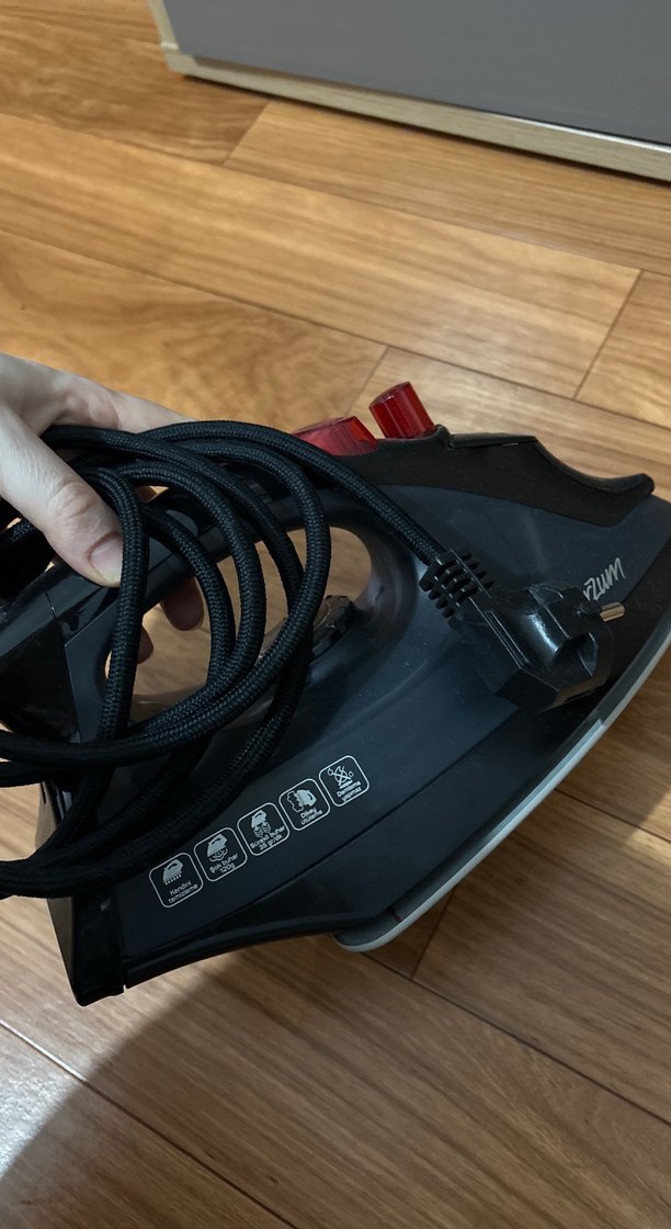 Uzun kablolu, çoklu buhar ayarlarına sahip siyah buharlı ütü. Pürüzsüz taban ve kullanımı kolay kontroller içerir. ⚫