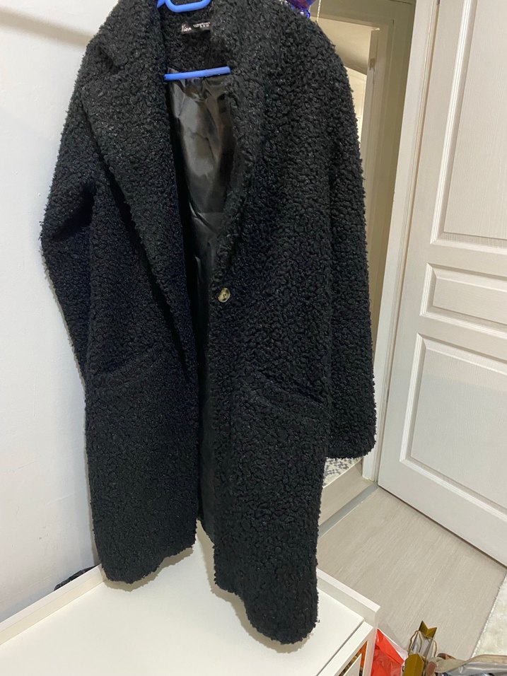 Siyah buklet kumaştan uzun kollu kaban, düğmeli ve astarlı, klasik yaka detaylıdır.