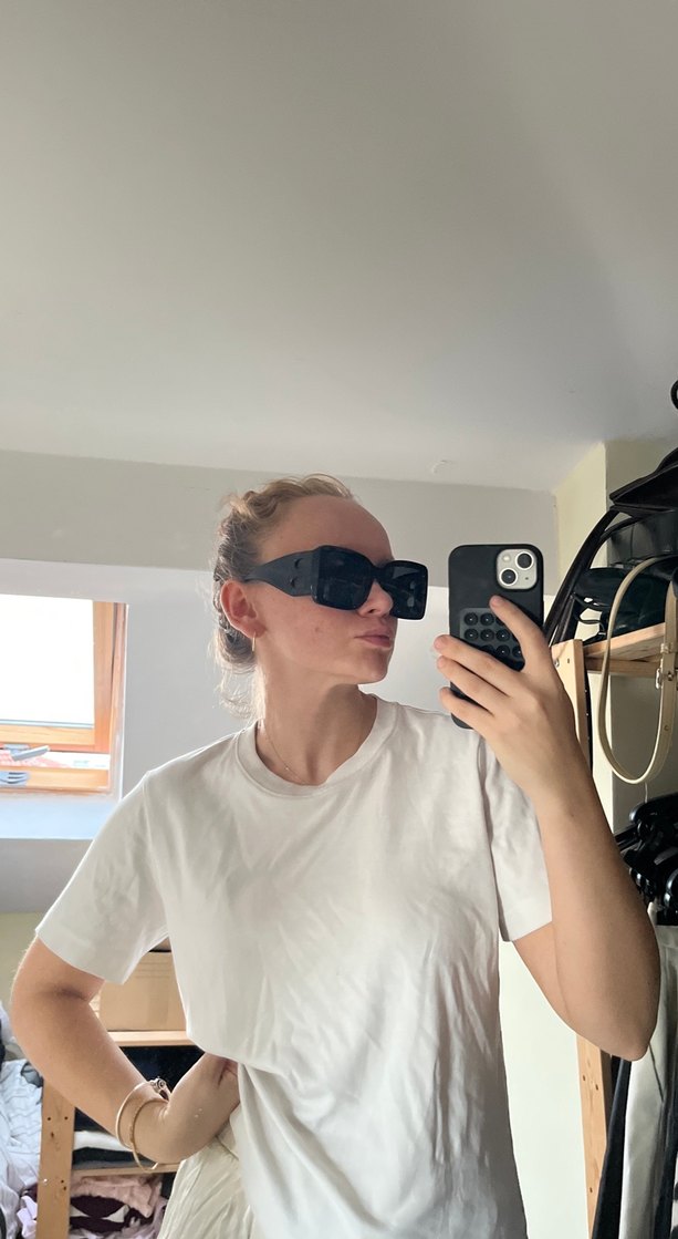 Siyah oversize güneş gözlüğü, minimalist ve avangart tarzıyla sokak modasına uygun, beyaz kıyafetlerle uyumlu şık bir seçimdir. ️