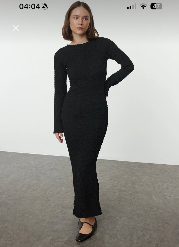 Siyah uzun kollu, triko dokulu, yuvarlak yakalı ve regular fit kesime sahip kadın elbisesi. Sentetik kumaştan, çağdaş ofis şıklığı için uygundur.