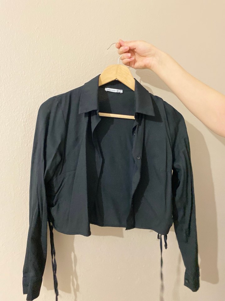 Bu siyah gömlek, uzun kollu ve kesimli yakaya sahiptir. Düğmeli ve vücuda oturur kenarları büzgülü