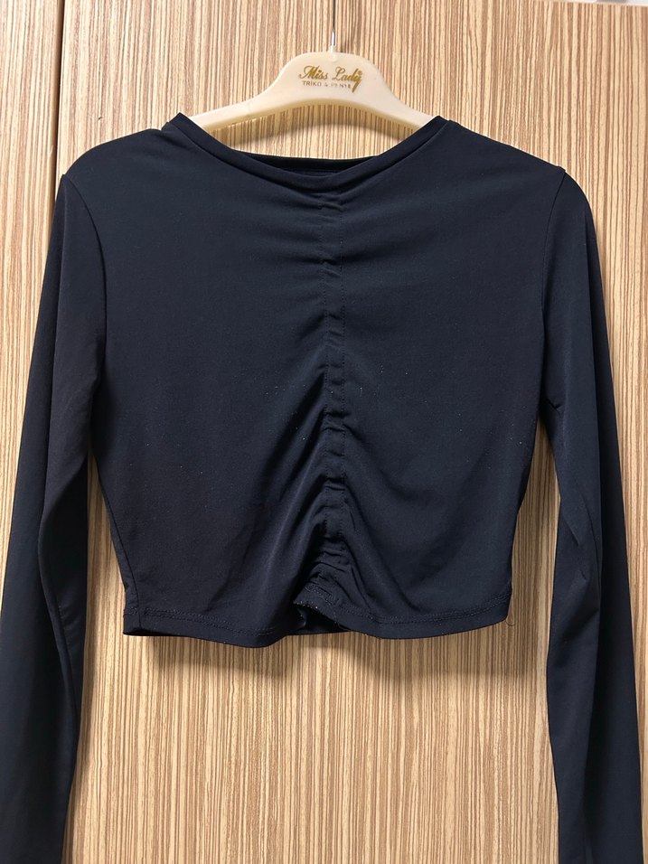 Siyah, dar kesim ve kısa boy crop bluz, yuvarlak yaka ve uzun kollu olup ortasında büzgü detayına sahiptir. Günlük sokak stili için uygundur.