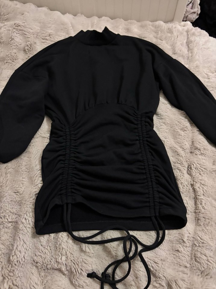 Siyah renkli, yüksek yakalı ve uzun kollu, yumuşak ve sıcak kumaştan triko elbise. Önde büzgülü drapeli detaylarla midi boyda, rahat ve trend goth tarzında.