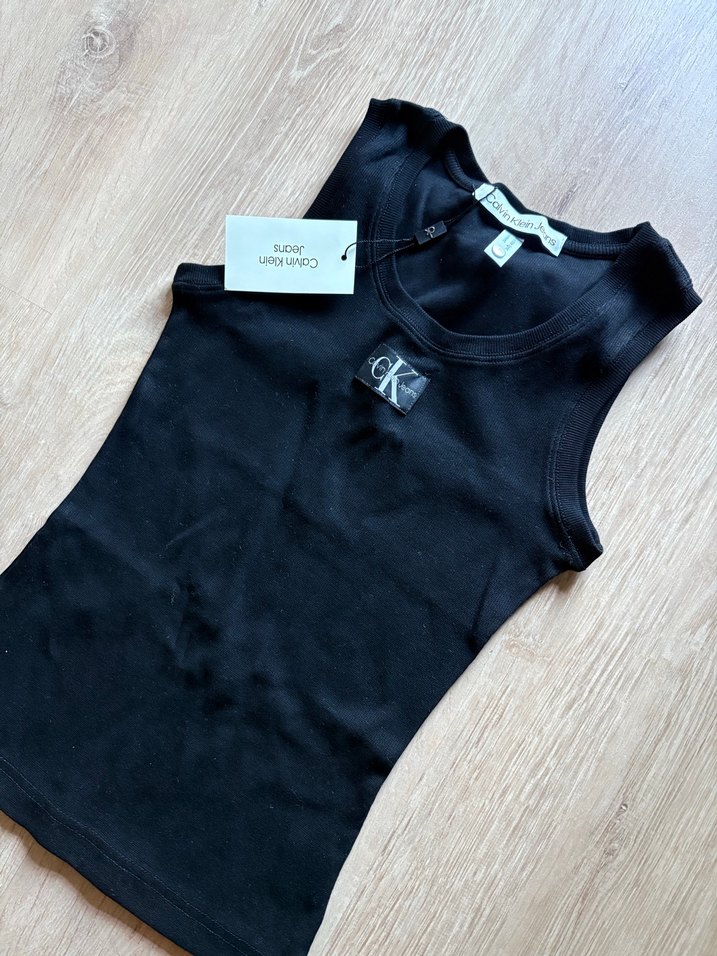 Calvin Klein'in siyah, baskılı logolu, pamuklu kumaştan yapılmış, bisiklet yaka ve kolsuz, vücuda oturan crop top modeli.