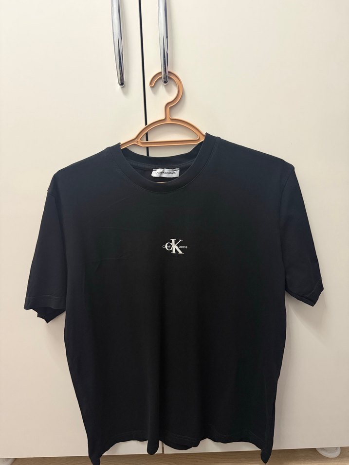 Kısa kollu, yuvarlak yakalı siyah Calvin Klein erkek tişörtü. Pamuklu, bol kesim ve minimalist baskılı logo ile günlük rahat stil için uygundur.