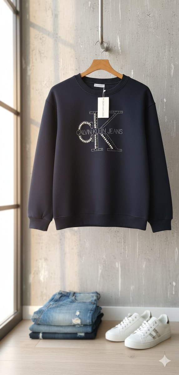 Siyah Calvin Klein Jeans sweatshirt, uzun kollu ve yuvarlak yaka, bol kesim, nakışlı ve pul işlemeli logo baskılı. Günlük kullanım için rahat.