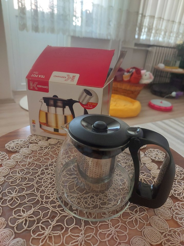 Siyah saplı, cam gövdeli ve demliği bulunan çaydanlık. bitki çayı için alındı 1 kere kullanıldı sorunsuz.
