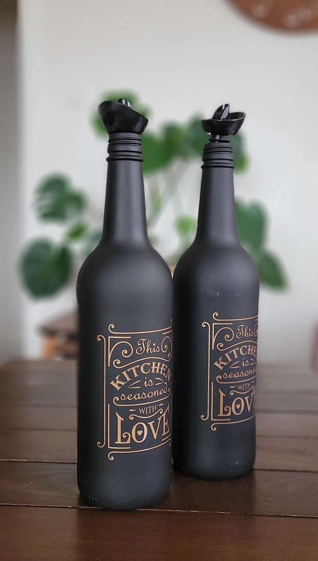 Mat siyah cam mutfak yağ şişeleri, üzerinde "Kitchen is seasoned with love" yazısı bulunur. Mutfakta kullanım için uygundur. Hiç kullanılmadı, beklerken üzerinde bazı çizikler oluştu, görsellerde mevcut.