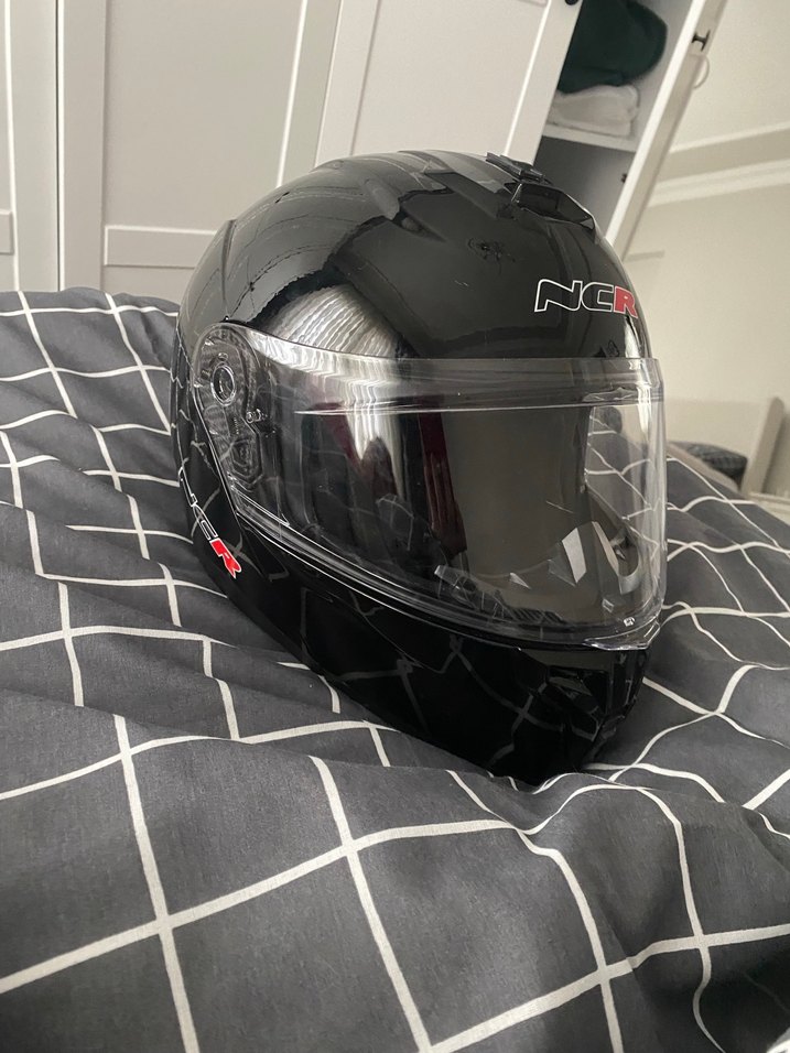 Tokalı, siyah camlı motosiklet kaskı, şeffaf vizörlü ve desen içermeyen sade tasarım. Hafif çiziği vardır onun dışında bir sıkıntısı yok az kullanıldı. L beden