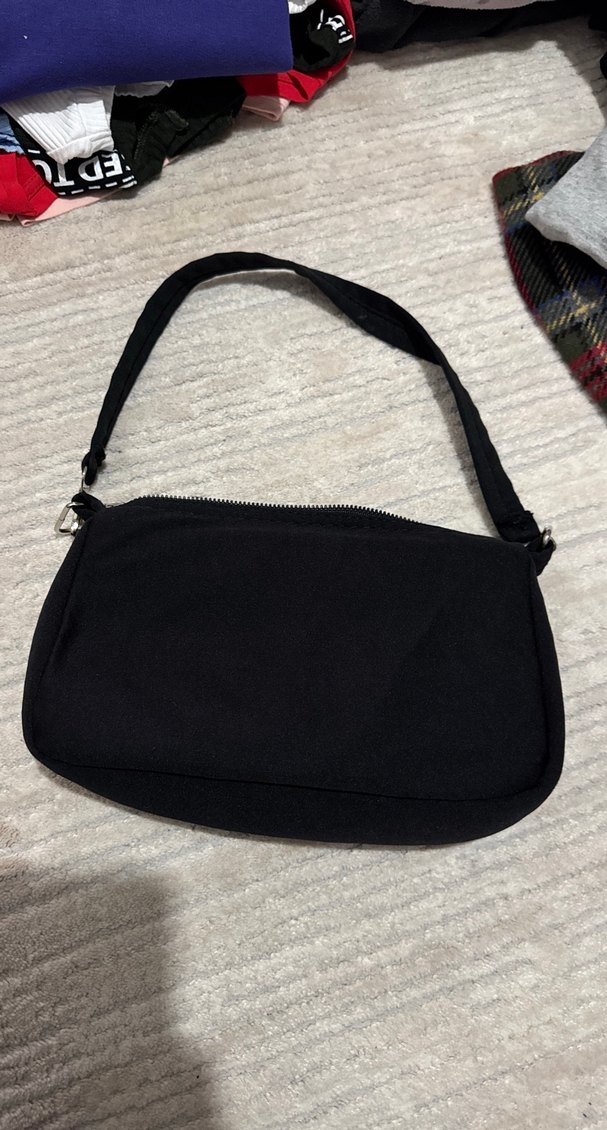 Siyah, yumuşak ve sıcak dokulu kumaştan yapılmış, ayarlanabilir askılı sade kadın omuz çantası. Yıkanabilir