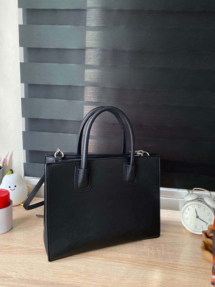 Siyah deri, desen içermeyen bu çanta, çift saplı ve çağdaş klasik şıklık sunar, ofis kullanımı için uygundur. Hiç kullanmadım çok iyi durumda