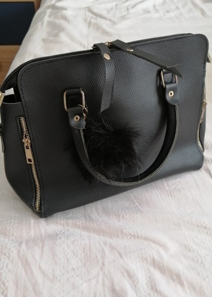 Ponponlu iki fermuarlı kenarında fermuar detaylı siyah çanta #siyah #çanta