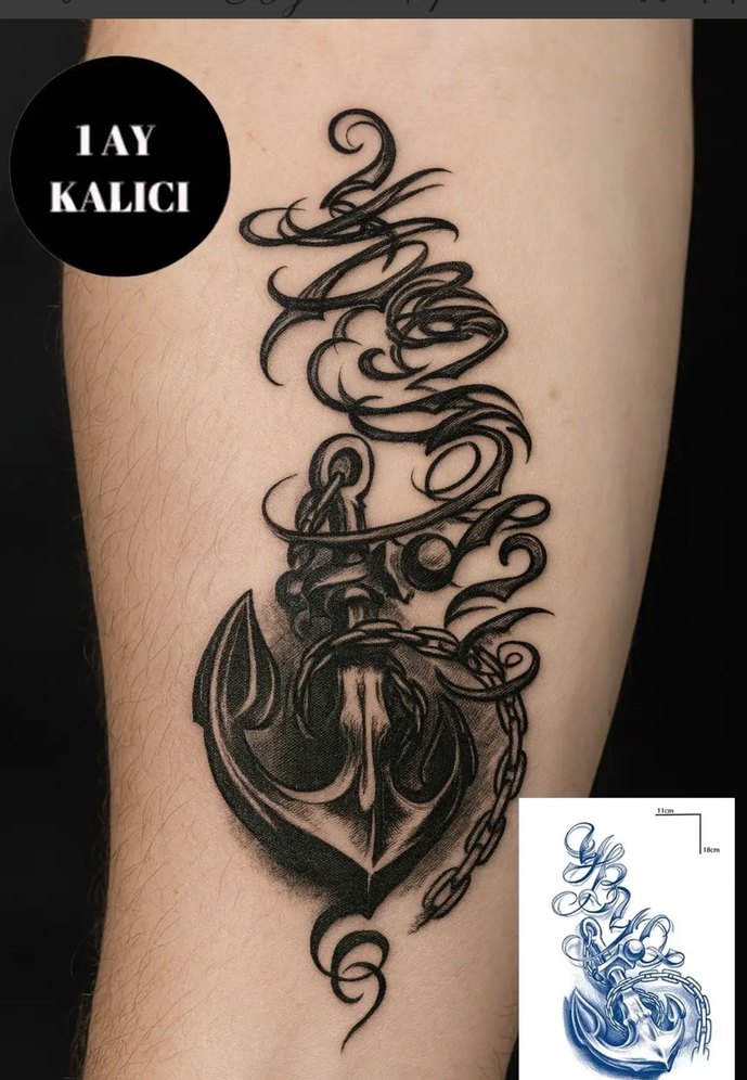 Koyu siyah renkli, gotik yazılı çapa geçici dövme. 1 ay kalıcı ve cesur tarzda bir görünüm sunar. ⚓