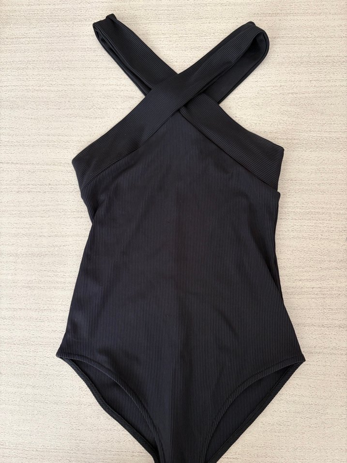 Siyah renkte, çapraz askılı ve vücuda oturan yapısıyla, günlük kullanıma uygun çağdaş ve cesur bir kadın mayosu.