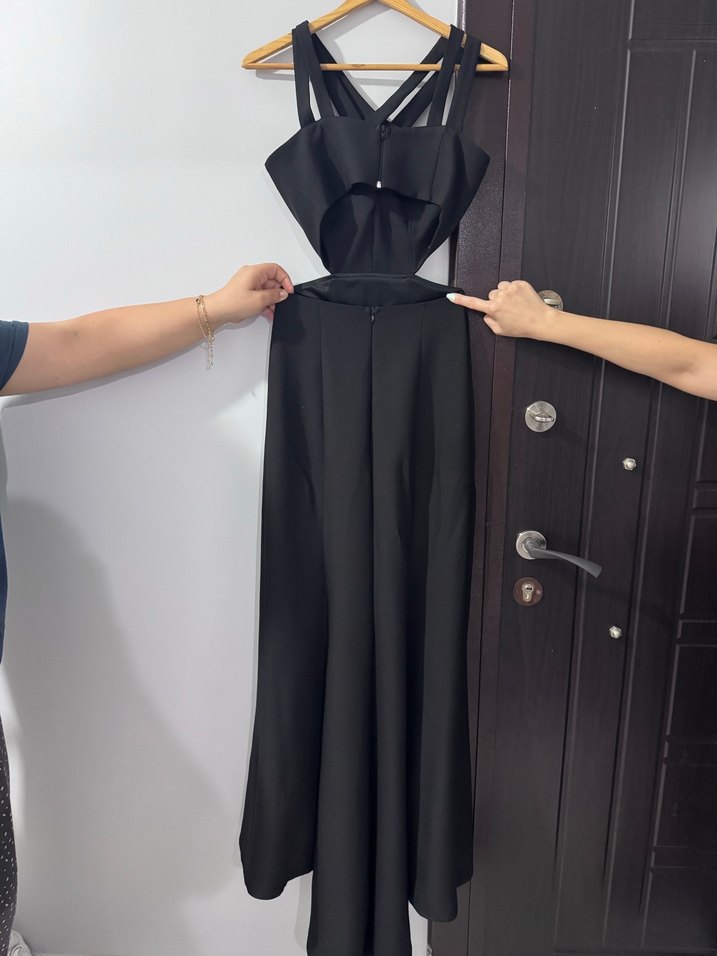 Bu siyah uzun elbise, çapraz yakalı kolsuz  sadece bir kere kullandım bedeni XS/S