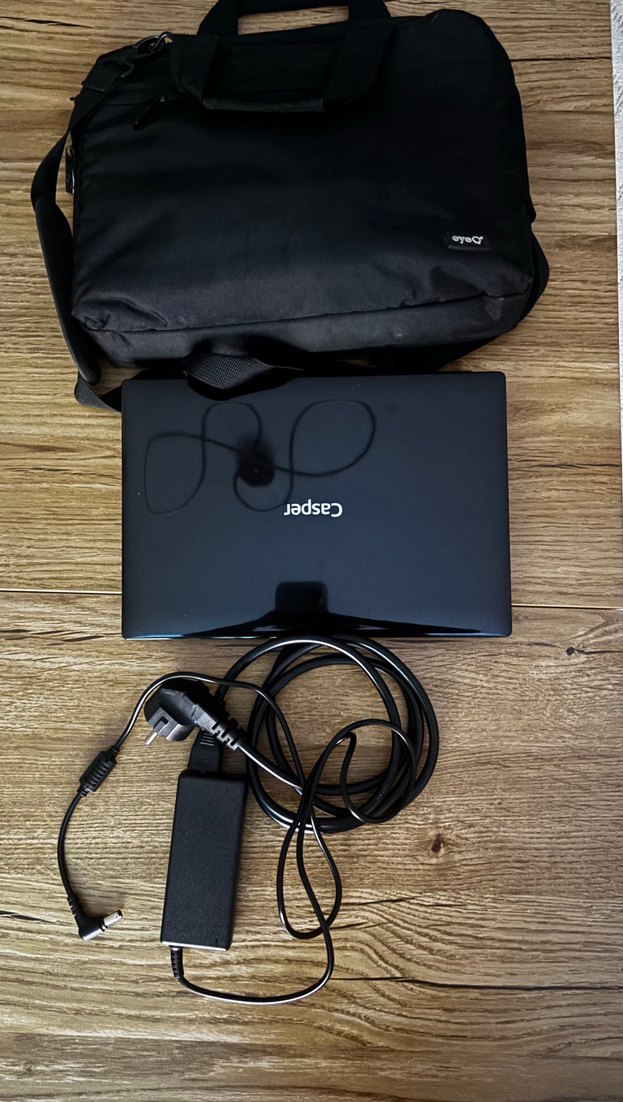 Siyah Casper laptop, uyumlu siyah taşıma çantası ve şarj cihazı ile birlikte. Taşınabilir kullanım için uygun.