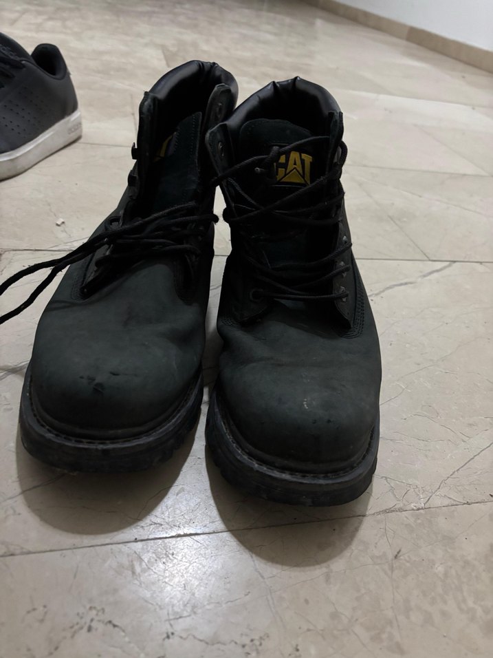 Siyah Caterpillar erkek botları, tokalı detaylara sahip. Dayanıklı malzeme ve sokak stili ile günlük rahat kullanıma uygun.