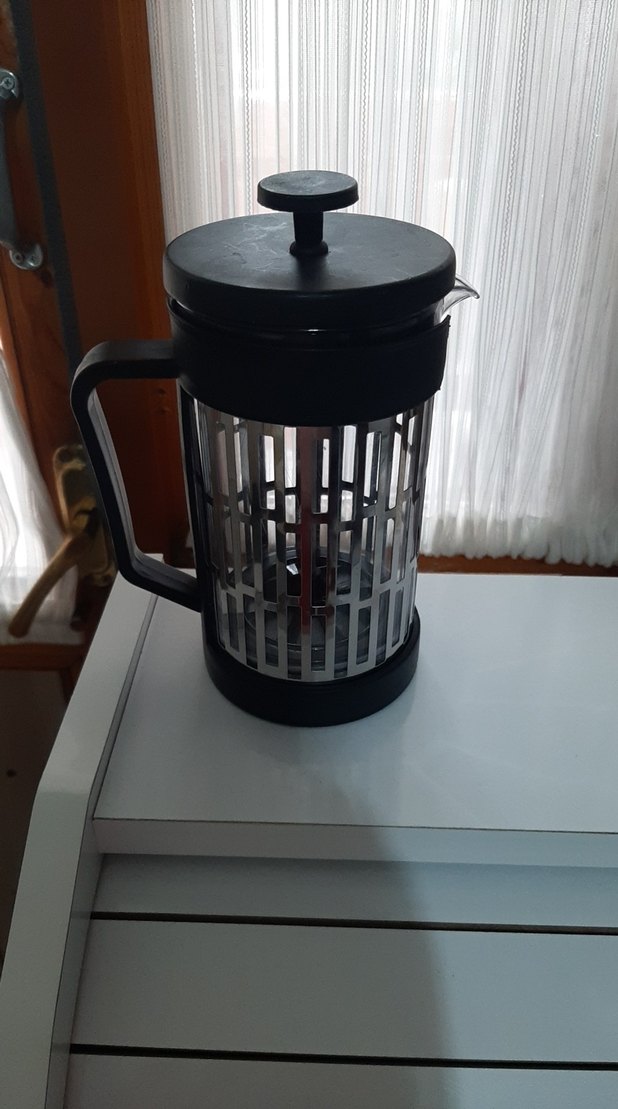 Siyah renkte, kolu ve pistonlu kapağı olan çay demliği. Şeffaf gövdesinde ızgara deseni bulunur.