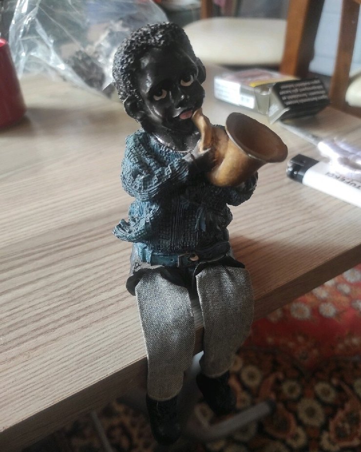Koyu renk kıyafetler giymiş, trompet çalan siyah caz müzisyeni figürini. Oturur pozisyonda ve detaylı tasarımlı.