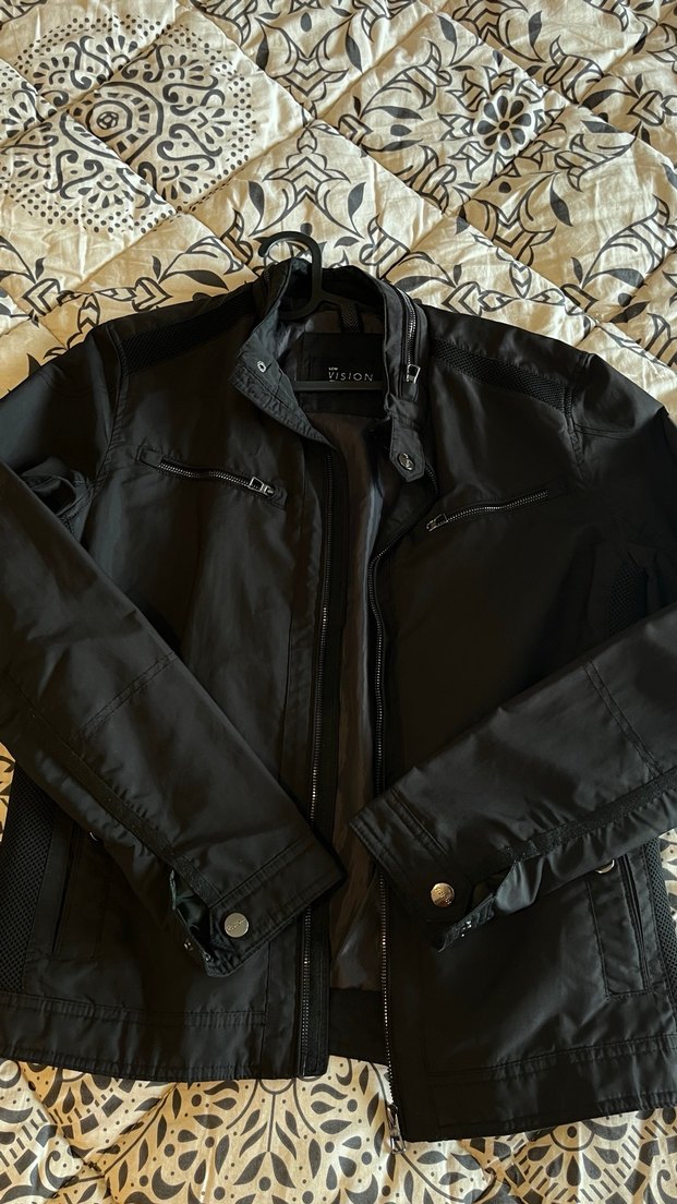 Notlu yaka ve fermuarlı detaylara sahip siyah deri biker ceket. Uzun kollu, normal kesim ve günlük kullanıma uygun.