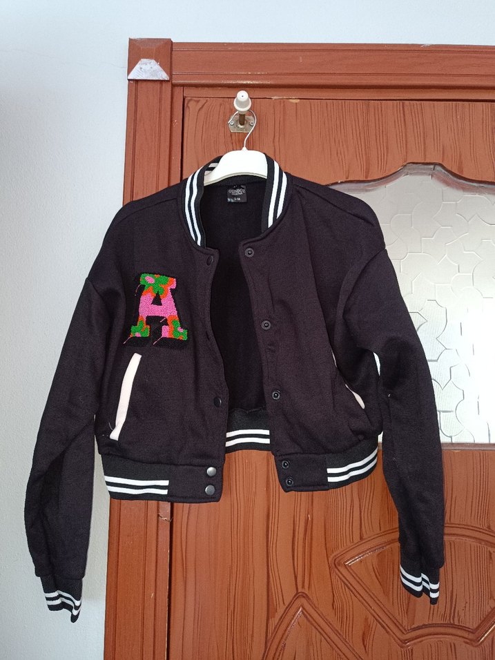 Düğmeli, baskılı siyah kız çocuk ceketi, hafif ve sıcak kumaştan, ribanalı yakası ve manşetleriyle şık ve rahat.