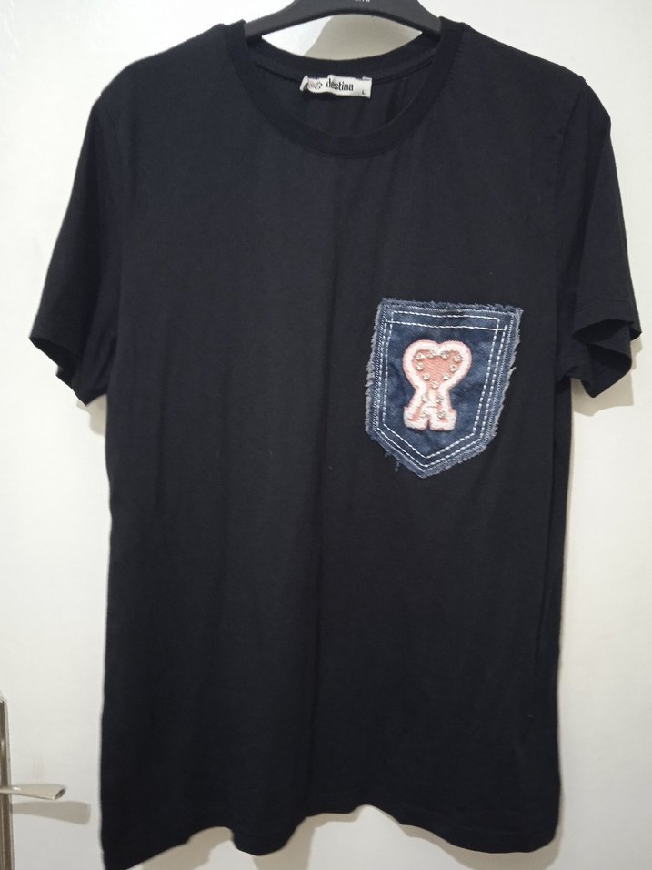 Siyah, kısa kollu, yuvarlak yakalı bol kesim tişört. Üzerinde baskılı tasarımlı ve düğmeli kot cep detayına sahiptir. Günlük rahat stil için uygundur.