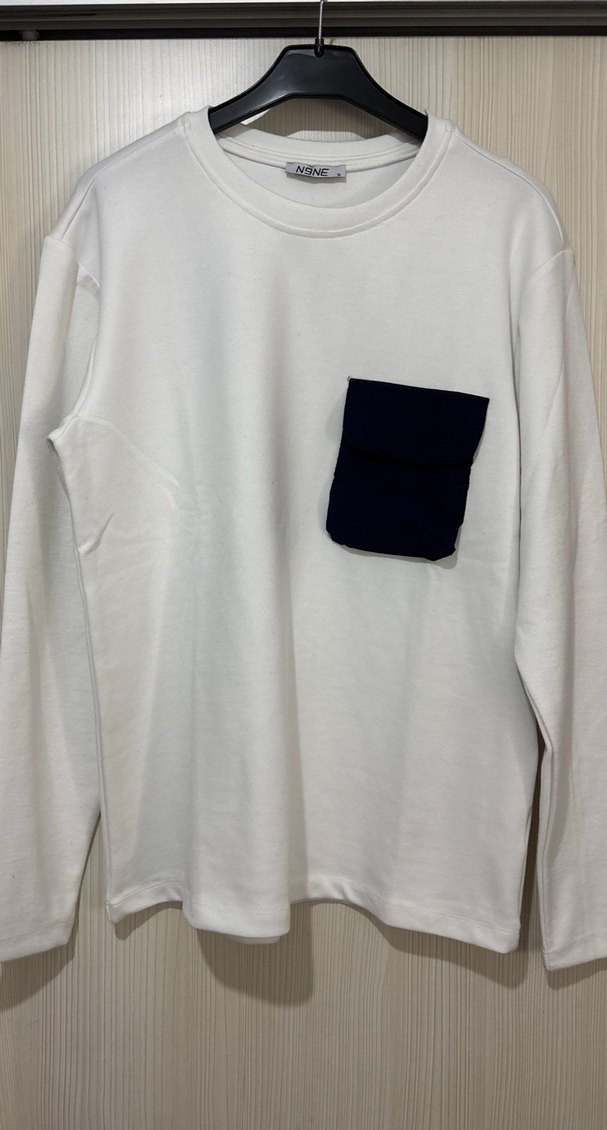 Uzun kollu, yuvarlak yaka ve bol kesime sahip beyaz kadın sweatshirt. Yumuşak ve sıcak kumaştan olup önünde koyu siyah cepli, günlük rahat stil için uygundur. Sıfır ürün