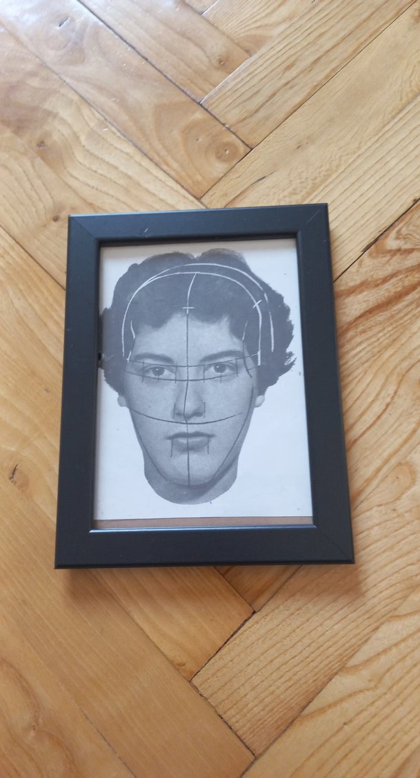 Yüz oranlarını gösteren çizgilerle gri tonlarda yapılmış koyu renkli bir portre çalışmasıdır, siyah çerçevelidir.